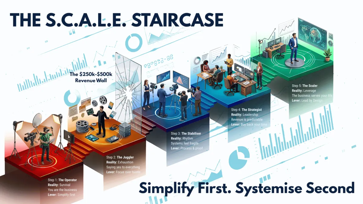 "The S.C.A.L.E. Staircase: Which stage are you in?" Every video business follows the same evolution. The goal isn't just to be 'bigger'; it's to move from the engine room (Operator) to the bridge (Scaler). Use the Pillars below to engineer your ascent..